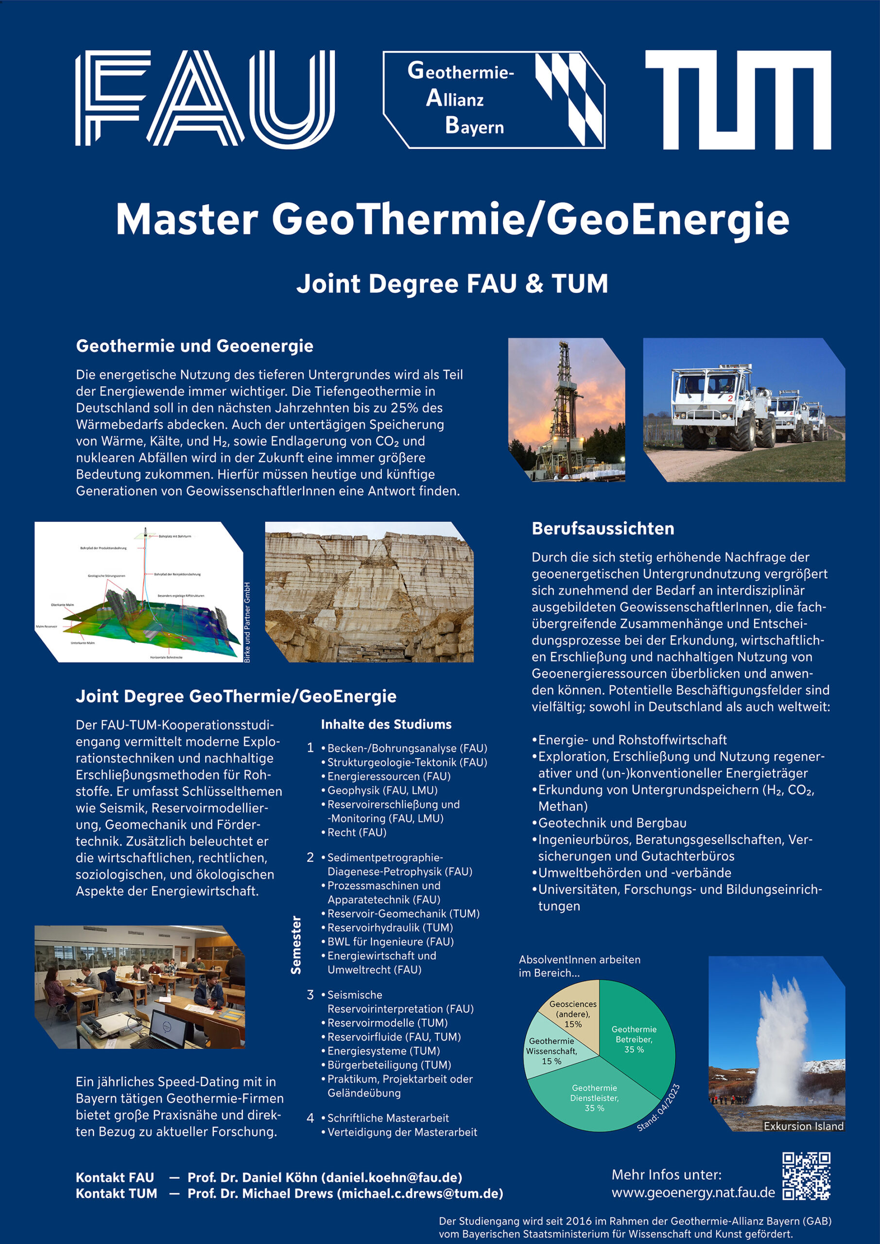 Der Masterstudiengang GeoThermie/GeoEnergie ist ein Joint Degree Studiengang mit der TU München (TUM), der eine fach- und standortübergreifende Kombination, der für Geoenergieressourcen relevanten Lehr- und Forschungsexpertise von 7 Fakultäten, anbietet.